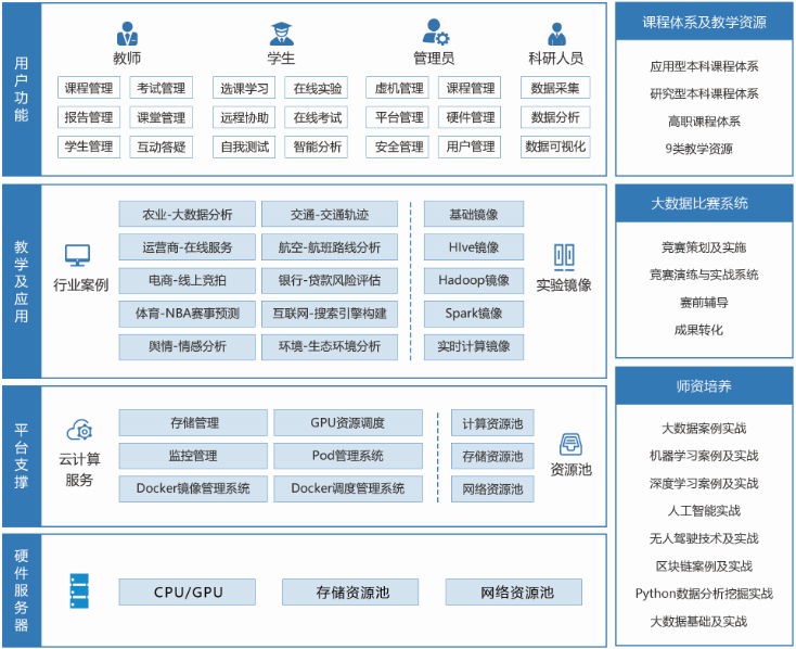 普開數(shù)據(jù)針高校進行了大數(shù)據(jù)教學(xué)管理、項目實踐、科研服務(wù)、創(chuàng)新孵化等實際應(yīng)用場景,大數(shù)據(jù)實驗室提供穩(wěn)定、可靠、高效的軟硬一體化大數(shù)據(jù)教學(xué)科研環(huán)境,以及完善的課程體系、項目數(shù)據(jù)和視頻、多樣化的教學(xué)手段和豐富的實戰(zhàn)案例。