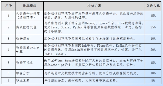 ?大賽為信創(chuàng)產(chǎn)業(yè)和機器人領(lǐng)域的融合發(fā)展搭建了重要平臺。賽項設(shè)置了多個應(yīng)用場景,如要求參賽者在這些平臺上完成大數(shù)據(jù)的完整生命周期,包括數(shù)據(jù)獲取、存儲、處理、計算、應(yīng)用和可視化。考核內(nèi)容包括在容器環(huán)境中搭建大數(shù)據(jù)平臺、進(jìn)行離線數(shù)據(jù)處理、數(shù)據(jù)挖掘、數(shù)據(jù)采集與實時計算、數(shù)據(jù)可視化以及綜合分析,旨在評估參賽者在信創(chuàng)技術(shù)環(huán)境下的綜合應(yīng)用能力。賽項注重產(chǎn)學(xué)研結(jié)合,邀請企業(yè)專家擔(dān)任評委,將企業(yè)的實際需求融入賽題,使參賽作品更具實用性和創(chuàng)新性。
