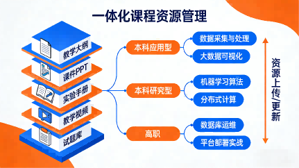 平臺打造完善的課程管理體系,實現(xiàn)課程資源的統(tǒng)一管理,涵蓋教學(xué)大綱、課件PPT、實驗手冊、配套視頻、鏡像資源、試題庫等核心教學(xué)素材。針對不同教學(xué)階段需求,平臺設(shè)置本科應(yīng)用型、本科研究型、高職三大課程體系,每門課程均提供教學(xué)實驗指導(dǎo)手冊、在線視頻、資源包、實驗示例代碼等完整配套資源,既滿足河北東方學(xué)院不同層次的教學(xué)需求,又能支撐標(biāo)準(zhǔn)化人才培養(yǎng)。